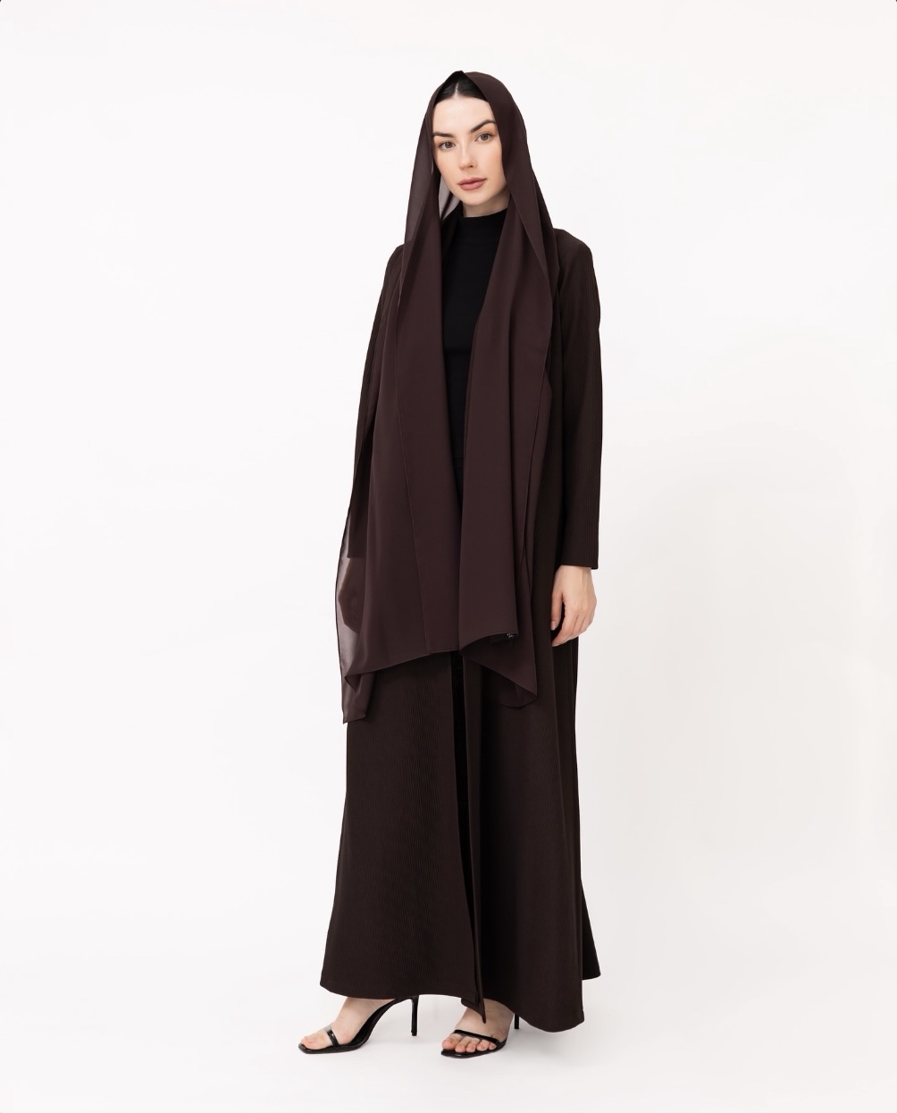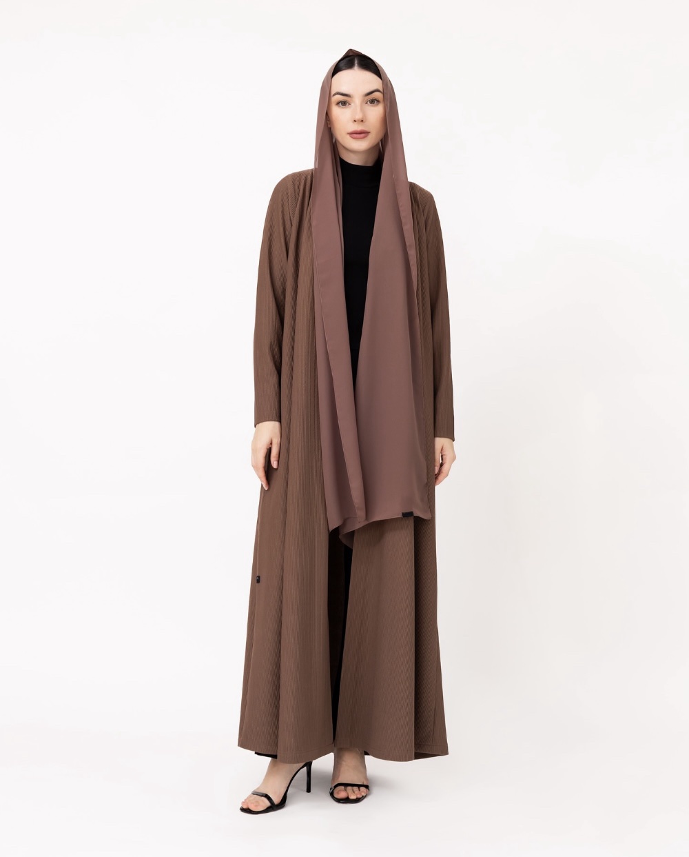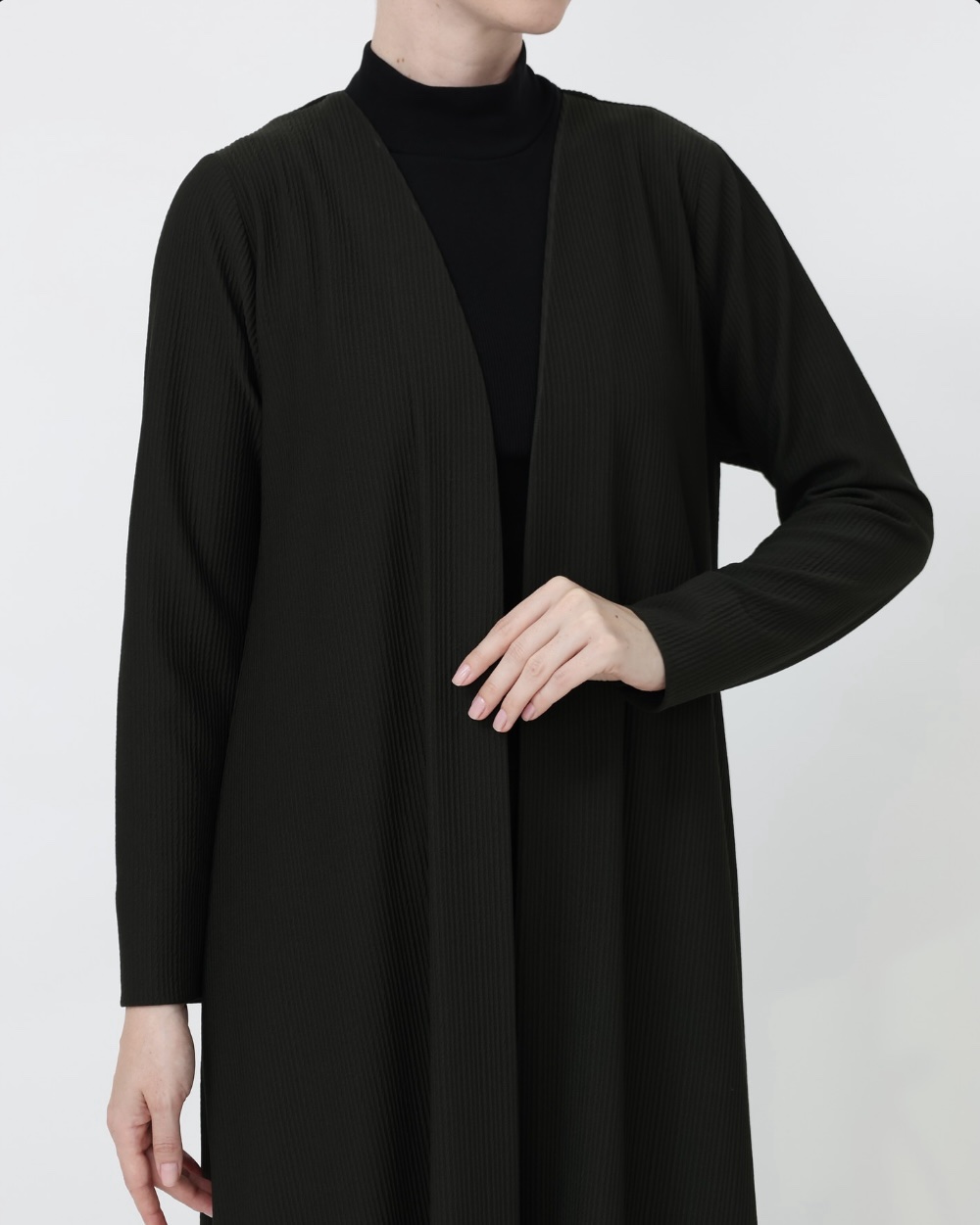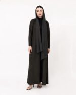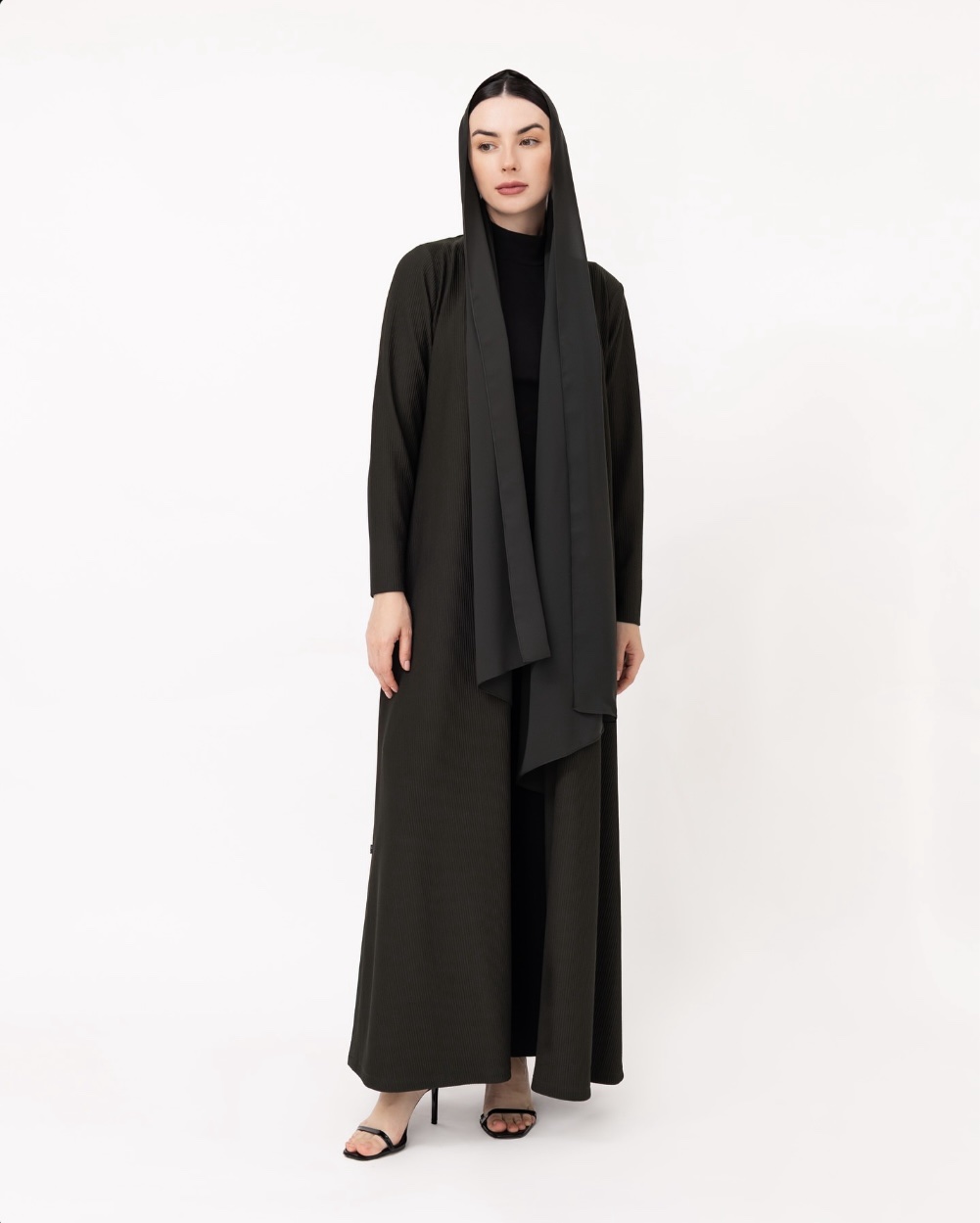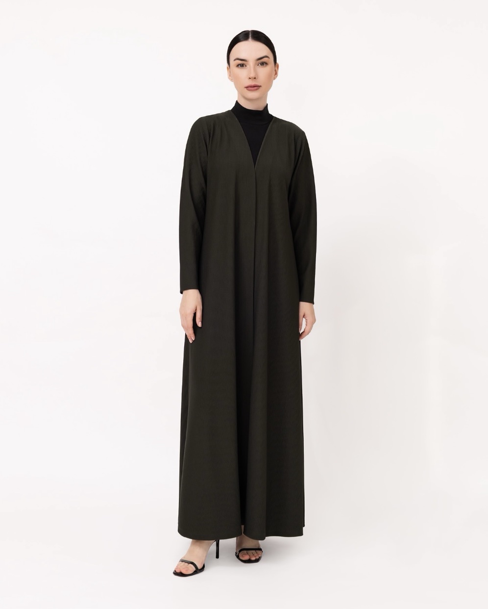 Cut in a deep charcoal olive, this abaya blends comfort with contemporary minimalism. The slightly stretchy textured fabric adds a soft, flexible fit that moves effortlessly with the body while maintaining a clean, structured look. Its vertical rib detailing elongates the silhouette, offering a refined balance of ease and elegance.