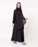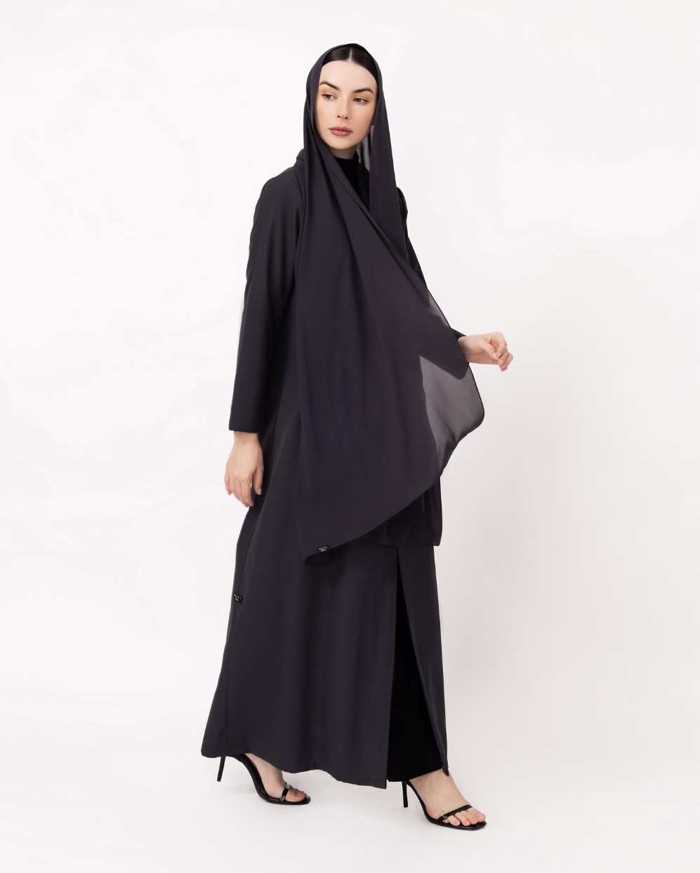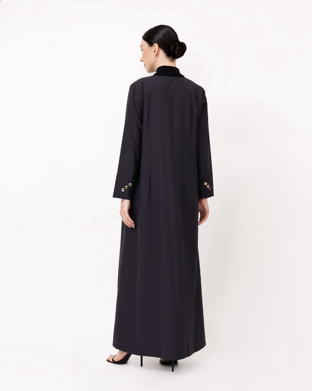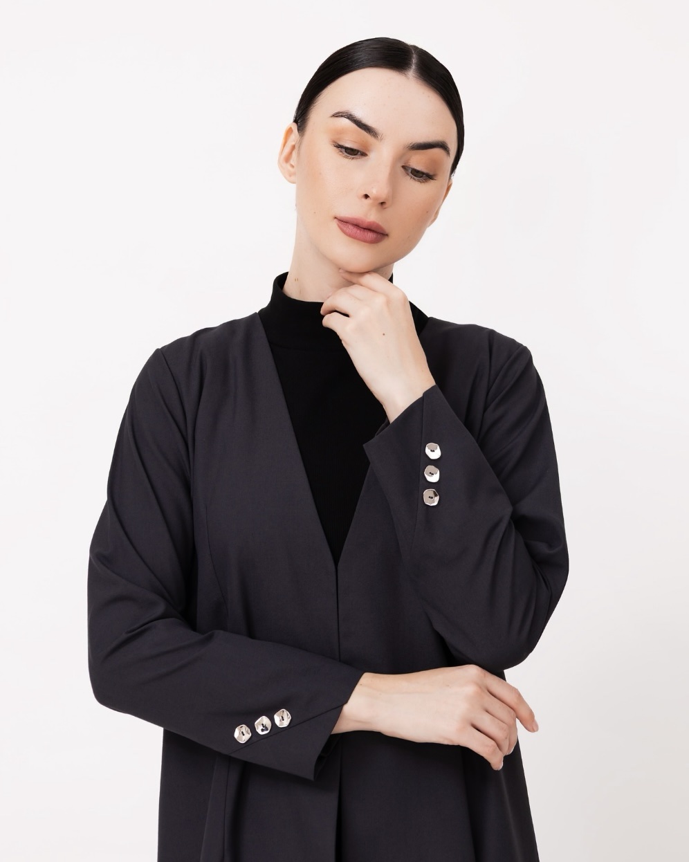 Defined by clean tailoring and refined simplicity, this abaya features a smooth, structured silhouette that falls effortlessly with every movement. The buttoned cuffs add a touch of sophistication, while the minimalist design highlights timeless elegance and modern ease.
