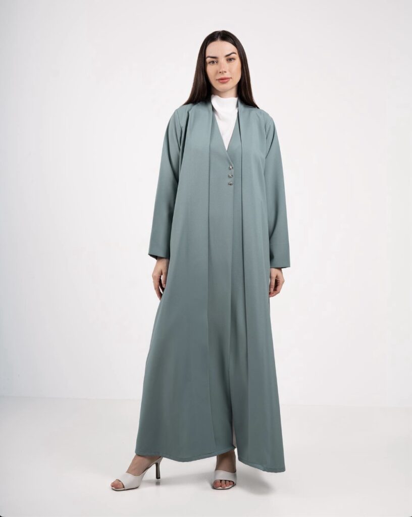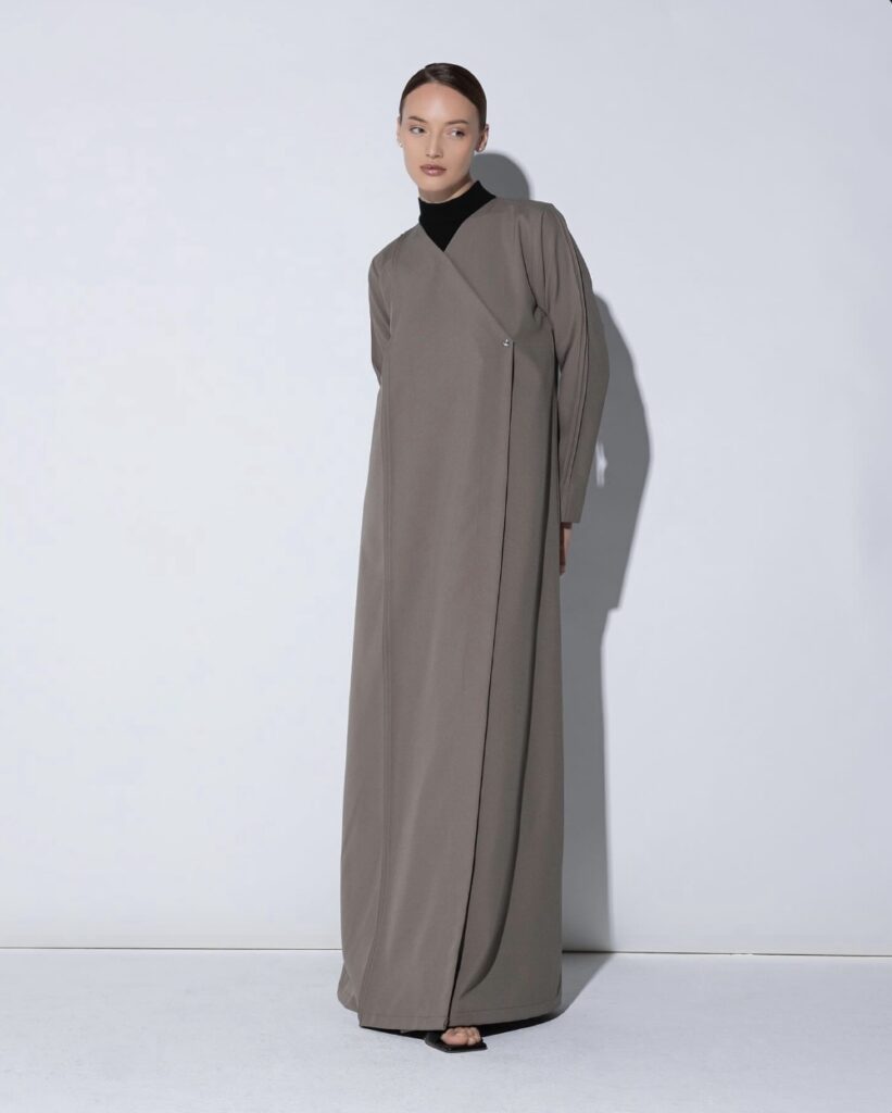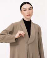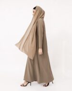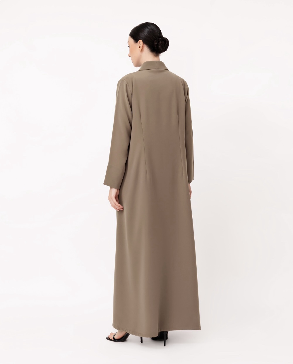 Tailored in a refined warm beige, this abaya captures the essence of timeless minimalism. The smooth fabric falls elegantly, shaping a soft, structured silhouette that moves with quiet grace. A single covered button accent at the front enhances its clean aesthetic, while the curved collar adds a touch of modern sophistication.