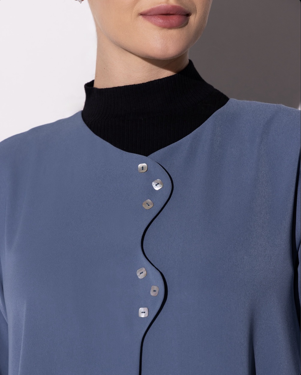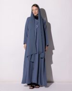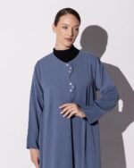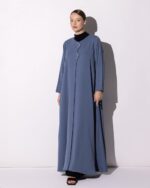 Crafted in a serene dusty blue, this abaya embodies lightness and fluidity through its wool chiffon fabric. The soft texture drapes effortlessly, creating a graceful flow with every movement. A gentle wave along the front button line adds a refined modern touch, balancing simplicity with delicate detail.