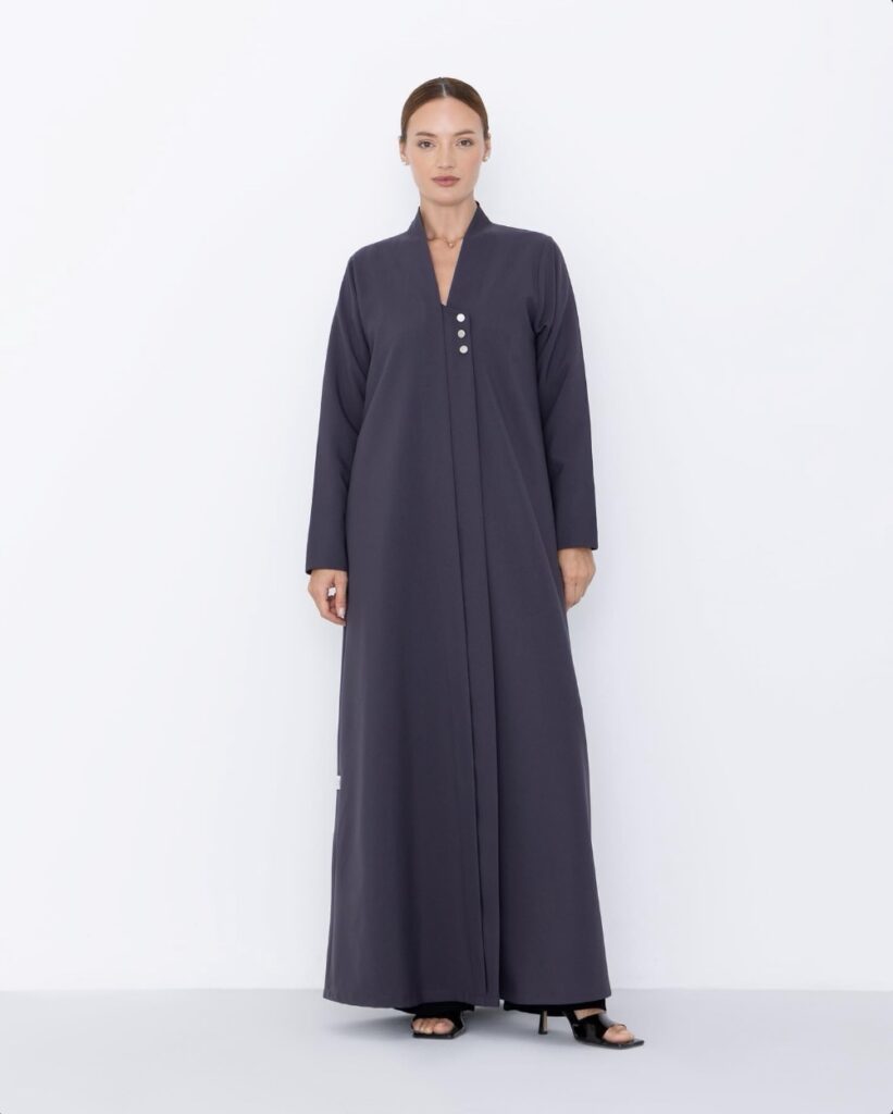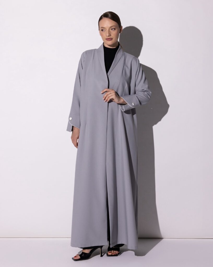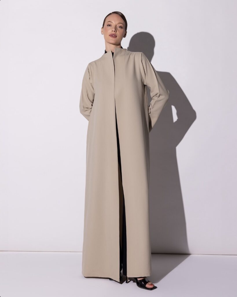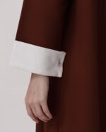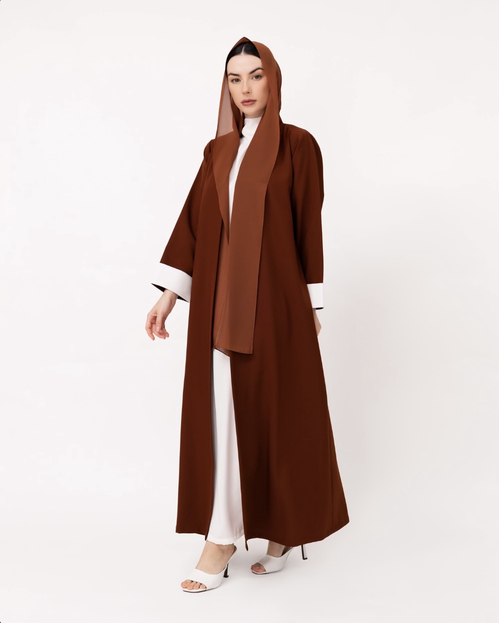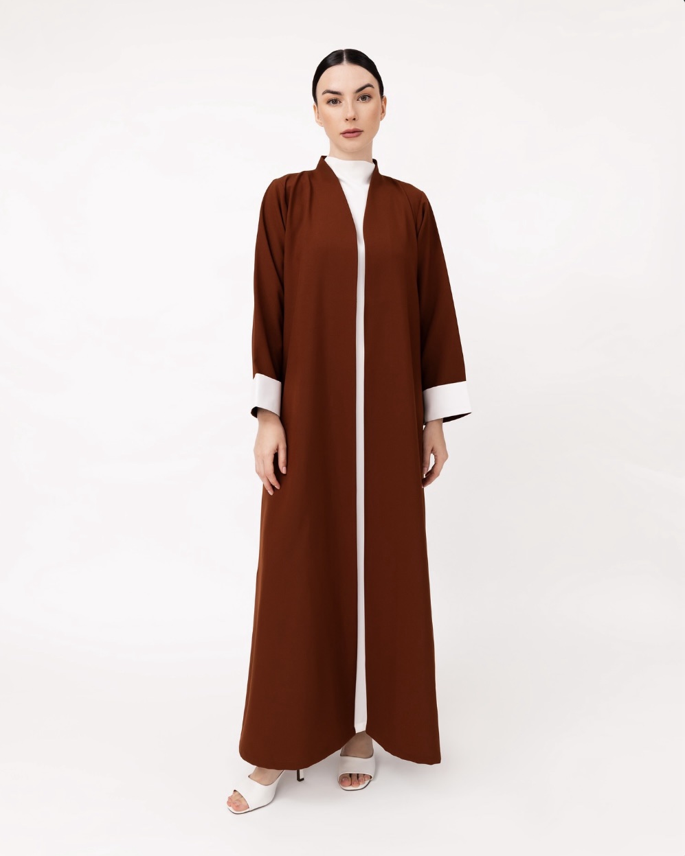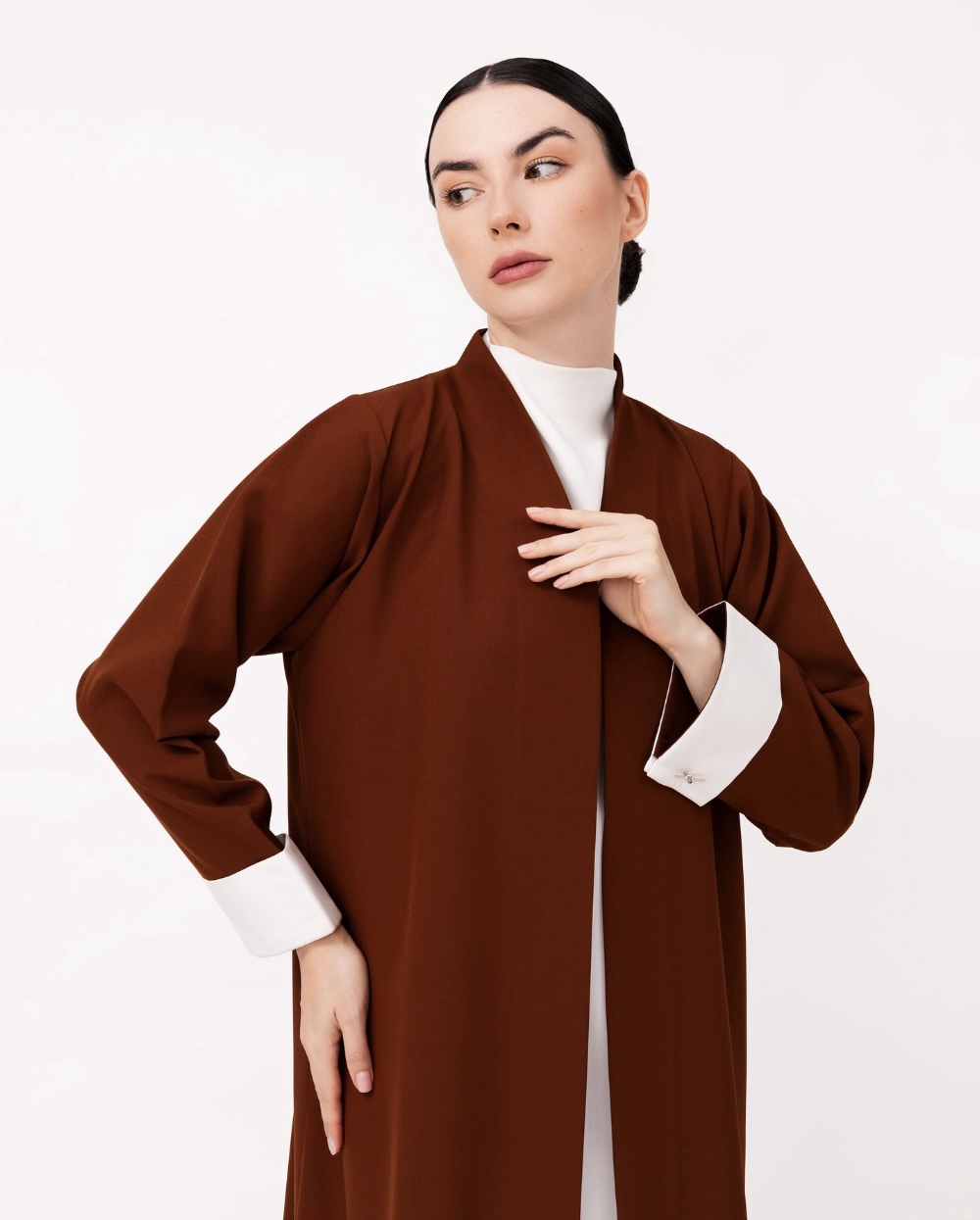 Rendered in a rich burnt chestnut brown, this abaya combines timeless sophistication with contemporary contrast. The clean silhouette is elevated by white cuffs and front trimming, finished with a subtle metallic accent on the sleeve for a touch of refinement. The interplay of warm and cool tones creates a balanced and striking composition.