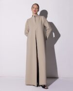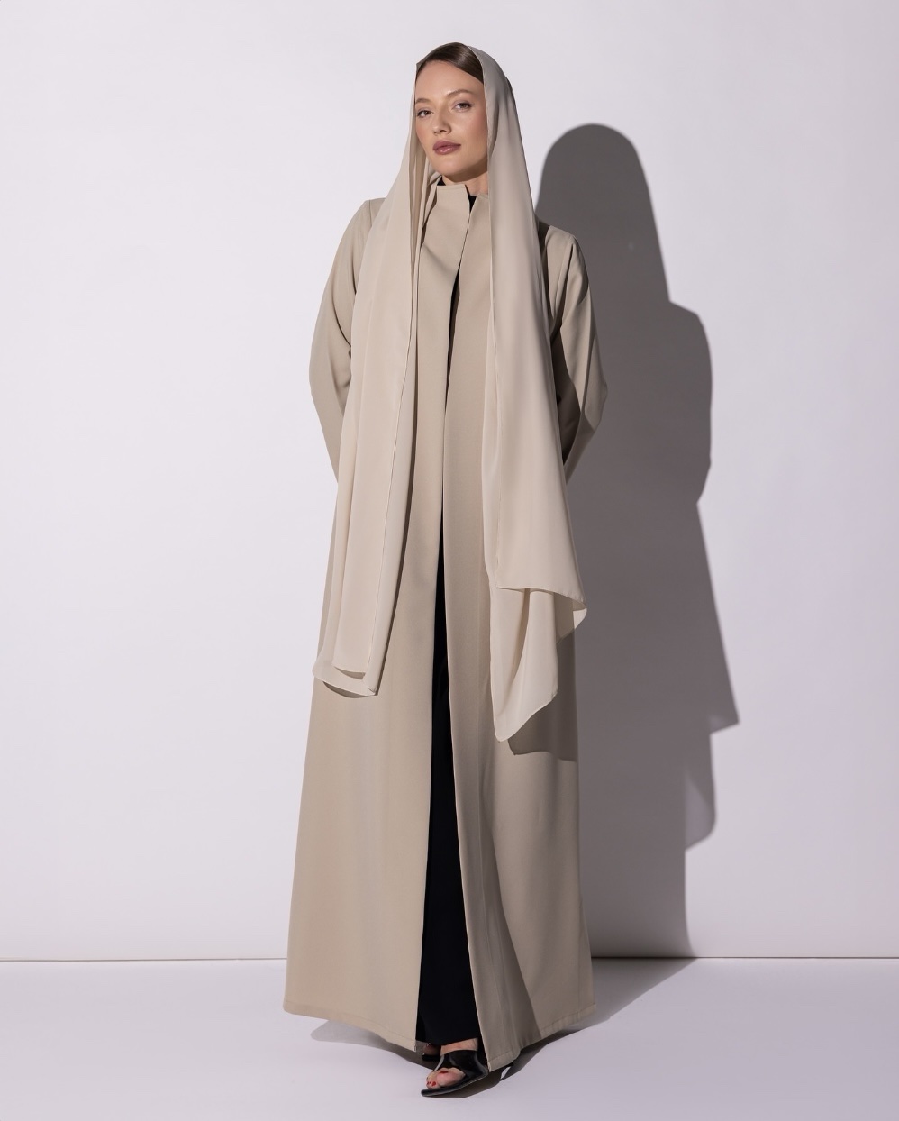 A refined statement of quiet elegance, this abaya is crafted in a soft sand beige tone, detailed with a delicate bee embroidery on the sleeve for a subtle touch of charm. The minimal silhouette highlights clean tailoring, while the intricate embellishment adds a whisper of artistry and individuality.