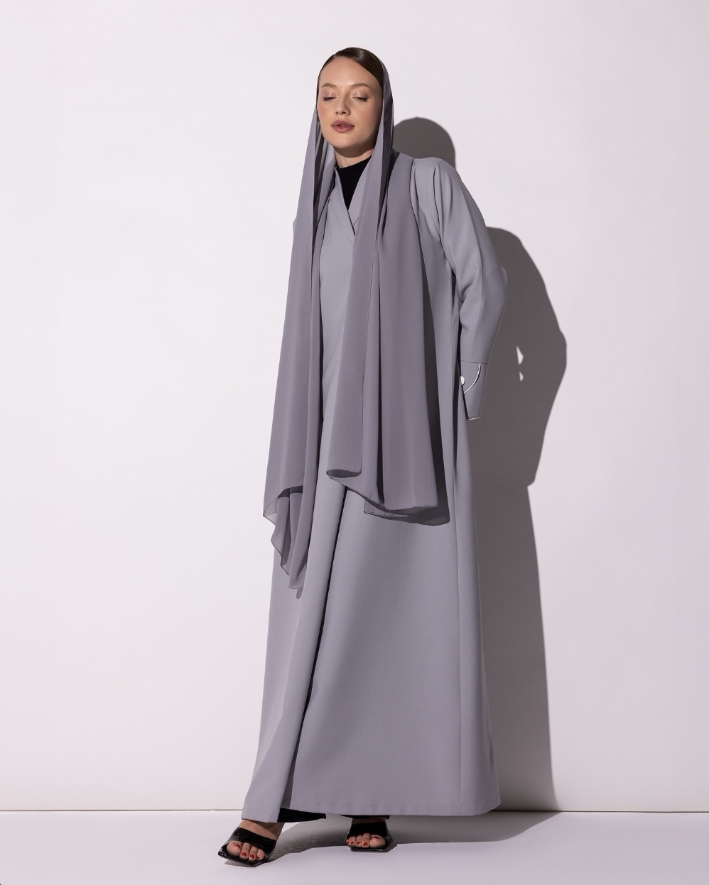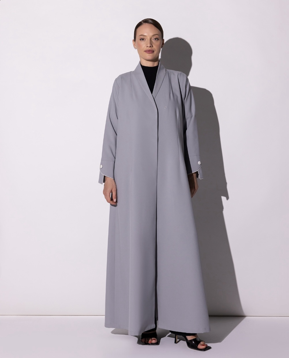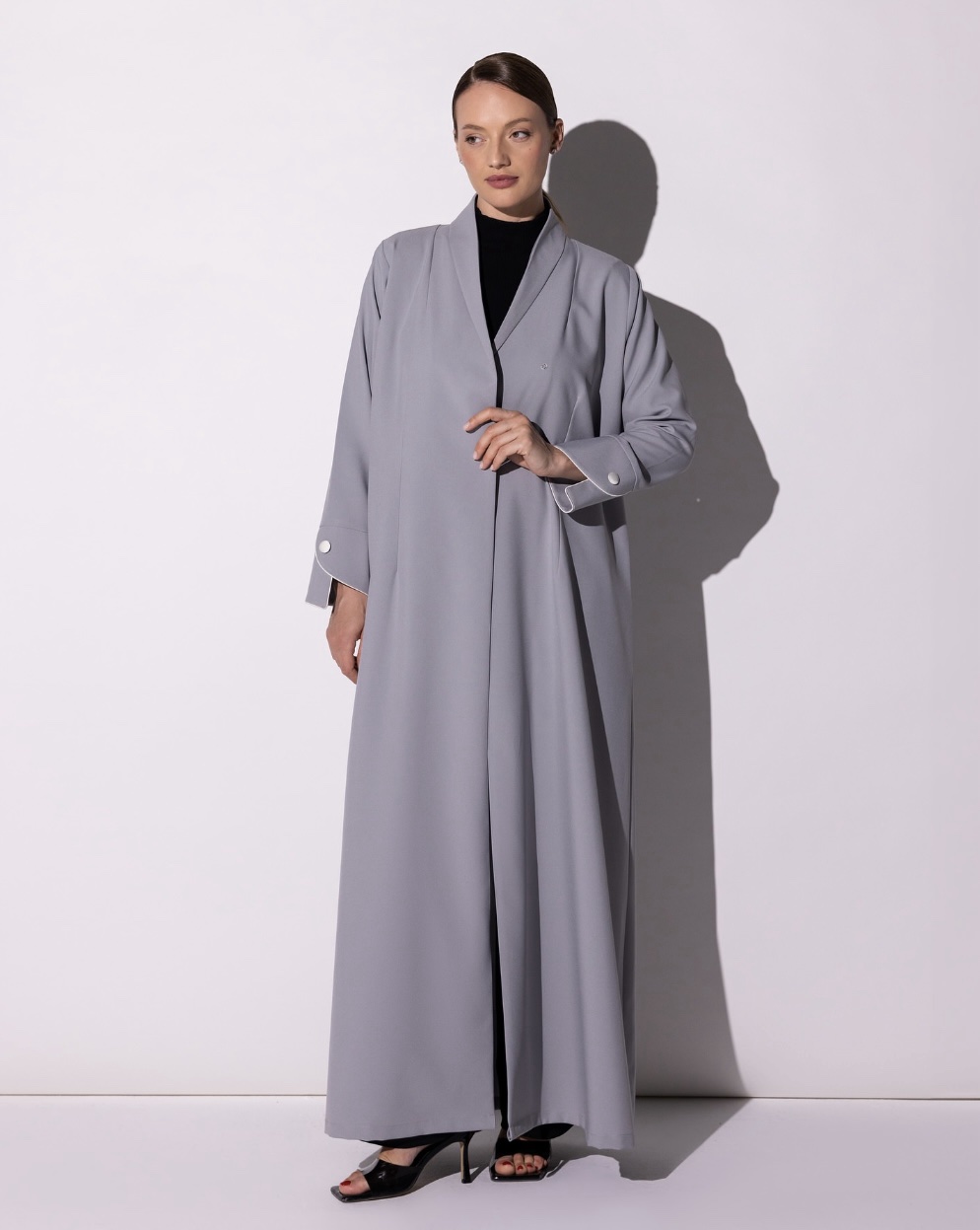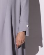Tailored in a soft light gray, this abaya embodies modern elegance through its clean lines and refined detailing. The wide cuffs, accented with subtle button embellishments and delicate white piping, add a graceful contrast that enhances its polished look. The fabric drapes beautifully offering structure without compromising on fluidity.