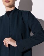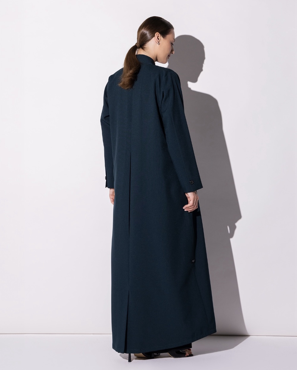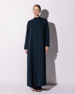 Rendered in a deep midnight teal, this abaya blends structure and fluidity with effortless sophistication. The back pleat detail adds gentle movement, while the tailored sleeves with button accents lend a refined finish. Its clean lines and smooth drape create a silhouette that is both modern and timeless.